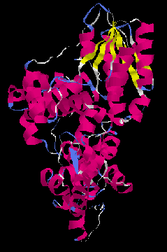 Figure 1: Ribbon drawing of the three-dimensional structure of DNA photolyase from E. coli[4] The structure of DNA photolyase from Escherichia coli has recently been determined by X-ray crystallography.[4,5] The overall structure, shown in Figure 1, consists of five parallel beta-strands, twenty alpha-helices and five short 310 helices which are organized in three major domains. One domain is formed by the beta-strands and four alpha-helices that bind the second cofactor MTHF. The other two, formed by the helical structures, are separated by a hole in the otherwise relatively flat protein surface. Based on the position of the noncovalentely bond flavine cofactor in this hole, the authors proposed that it constitutes the active site of DNA photolyase. This is also supported by the fact that the size of the opening is suitable for binding of a CPD (compare also Figure 6). The rim and one side of the binding site are positively charged (Arg226, Arg342 and Arg397), whereas the interior on the other side is relatively hydrophobic (Phe150, Val270, Trp277, Tyr281, Met345, Trp384 and Ala392). The hole lies in the middle of a trace of positive electrostatic potential on the surface, designed to bind to the phosphate backbone of DNA. The mode of binding is, however, not known since there are no data on a enzyme-substrate complex available. Although there has been much interest in the mechanism of the electron transfer catalyzed cycloreversion,[6] the details of the reaction are still unknown. Figure 2 summarizes the mechanistic possibilities. Trapping and kinetic isotope effect (KIE) studies showed that the radical cationic pathway, induced by one-electron oxidation, proceeds via a singly linked intermediate. The structure of this intermediate and the reaction energetics are, however, not known. The mechanism of the biologically more relevant reductive, radical anionic pathway is even less clear since no intermediate could be trapped and the results from KIE studies are ambiguous. [7]