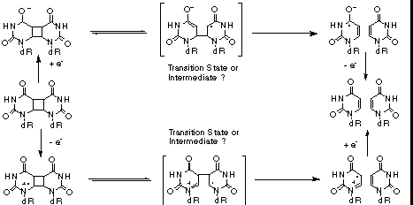 1. IntroductionThe major damage caused by UV radiation of DNA is the formation of cyclobutane pyrimidine dimers (CPD), which block replication and have cytotoxic and mutagenic effects.[3] The formation of CPD has been linked to certain types of skin cancer, the most widespread form of cancer in the US. Many organisms are capable of repairing this light-induced damage by another light-dependent step, catalyzed by the enzyme DNA photolyase.[6] This enzyme binds CPD in single or double stranded DNA essentially independent of the sequence with binding constants of ~ 10-9 M. Irradiation of this enzyme-substrate complex with visible light leads to an photoinduced electron transfer from a flavine to the dimer. The resulting radical anion then splits very rapidly to form the fully functional DNA after back electron transfer to the enzyme.