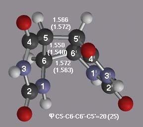 3 .Results and Discussion 3.1 The cis,syn Cyclobutane Uracil Dimer The Becke3LYP/6-31G* optimized structure of the cis,syn cyclobutane uracil dimer 1 is shown in Figure 3. The overall structure is in very good agreement with the reported X-ray structures of various derivatives of 1 [14] and with the UHF/6-31G* optimized structure of the cis,syn cyclobutane thymine dimer.[15] An important feature of this structure is the puckering of the central cyclobutane ring by 20o, which leads to a distortion of the C2-symmetry of the molecule. This is in marked contrast to the planar cyclobutane ring obtained by semiempirical calculations. [8] Although the force constants for the dihedral angles in the cyclobutane ring are relatively small, it is clear from the helical structure of DNA and the available X-ray crystallographic data that the puckered cyclobutane ring is present in all known derivatives of 1. The dihedral angle in this part of the molecule determines in turn the position of the more polar carbonyl groups. The remaining bond lengths and angles are in the typical range of their respective chemical environment.