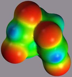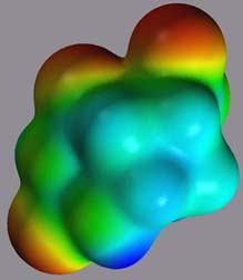 Figure 4: Electrostatic potential of 1 projected onto an isodensity surface. left: view of the polar carbonyl moiety; right: view of the nonpolar cyclobutane moiety The analysis of the HOMO and LUMO orbitals of 1, shown in Figure 5, allows an estimate of the effect of the electron transfer. In case of an oxidative electron transfer to form the radical cation 1*+, the C6-C6' bond will be weakened by the removal of an electron. In contrast, the LUMO is largely localized in the pyrimidine ring and features a nodal plane perpendicular to the cyclobutyl ring. A reductive electron transfer to form 1*- will therefore have a smaller effect on the structure of the initial product of the electron transfer, 1*-.