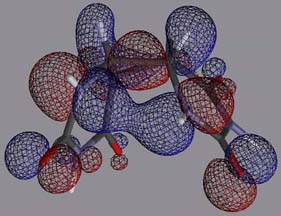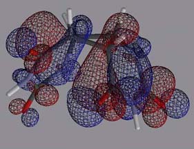Figure 5: HOMO (left) and LUMO (right) of 1 The polarity pattern of 1 is in excellent agreement with the mode of binding suggested by Park et. al. [4] Based on the three dimensional structure of the active site of DNA photolyase, shown in Figure 6, and the results described above, the following binding mode can be anticipated: The more polar moiety of 1 could form binding interactions with the polar region of the active site (formed by the FAD, Asn273, Arg342, Arg344 and Asn273). In this orientation, one of the planar pyrimidine rings could interact via a pi-pi interaction with the isoalloxazine ring system of FAD. The nonpolar cyclobutane part could then interact with the hydrophobic amino acid residues Trp277, Trp384 and Tyr281. In this orientation, 1 would have a diameter of aproximately 6.5 Å in the plane parallel to the protein surface, suitable for a fit into the putative active site as shown in Figure 6, right. Further docking studies to investigate the geometry of the enzyme-substrate complex and to estimate the energy of binding are in progress and will be reported in due course.
