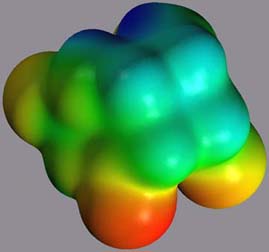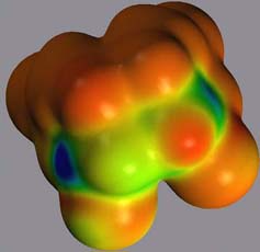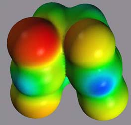Figure 9: Electrostatic potential of 1*-, projected onto an isodensity surface. left: view of the carbonyl moiety; right: view of the cyclobutane moiety