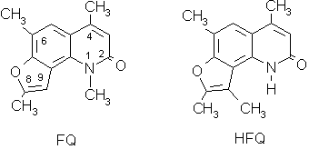 We have recently studied some properties of two angular furoquinolinones, which can be regarded as angelicin isosters, 1,4,6,8-tetramethyl-2H-furo[2,3-h]quinolin-2-one (FQ) and 4,6,8,9-tetramethyl-2H-furo[2,3-h]-quinolin-2-one (HFQ). The main difference in the structure is at N1, which carries a methyl group in FQ and a hydrogen atom in HFQ. Both compounds are characterised by a strong capacity of damaging DNA and a high photosensitizing activity. Table 1 shows the damage induced in DNA in comparison with 8-MOP.