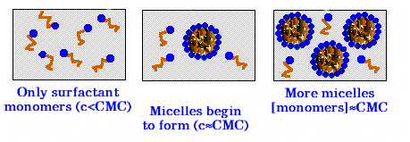 where R=8.31·107 erg/mol·K, T is the absolute temperature, and NA is the Avogadro number. For the previous plot, A was calculated as 47 Å2/molecule. When the surfactant is charged, A must be multiplied by a factor 2. The CMC value is affected by several factors, first of all by the chamical structure of the tenside (hydrophilic/hydrophobic balance, charges, branching groups, unsaturated bonds), by the temperature and by the presence of other molecules and/or ionic species. The shape and the size of the supramolecular structures - that is the number of monomers per aggregate ("aggregation number", g) - depend on the chemical nature and geometry of the surfactant, on the monomers' concentration and on the temperature. More recently the formation of large interface aggregates in non-aqueous solvents and with different types of chains has been reported in several papers, provided that the selective solvent plays different interactions with the two incompatible building blocks of the solute. As an example, a semifluorinated n-alkane, bearing a hydrogenated segment linked to a fluorinated block, can form aggregates in a fluorocarbon such as perfluorooctane, because of the well-known mutual immiscibility of hydrocarbons and fluorocarbons. The self-assembling of surfactants in water and related properties are well described in several books (5). As already mentioned in the previous section, a large number